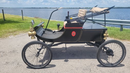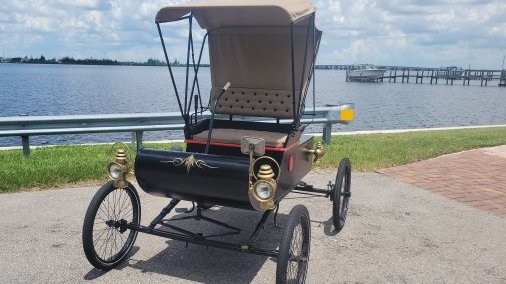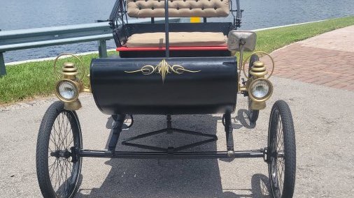 Custom built 1901 Oldsmobile Curved Dash replica is hand-built in 1959 with marine plywood body. It is adorned with black paint, red trim and gold pinstripes. This model was the bestselling car in America from 1902 to 1905. The newly upholstered seats are button tuft and it has a custom made canopy. As with the original, steering is done with a Tiller.