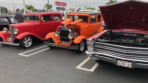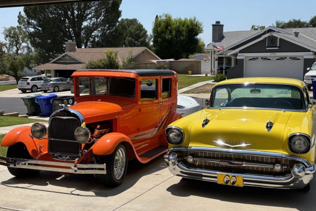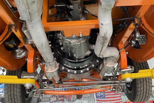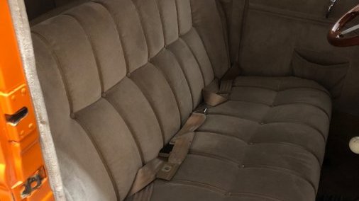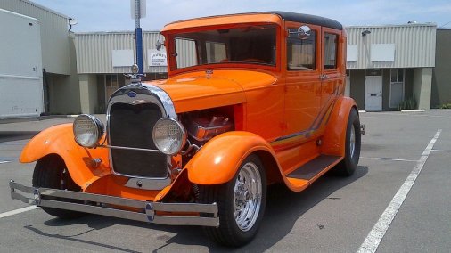 Bright orange with graphic on the side 4 door sedan. Pro-street style 14" wide tires in the back, big block chevy motor over 500hp. 4 speed manual. 4 door with stock suicide doors in the back. Lite tan interior and simple/clean interior accents.