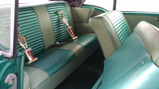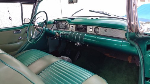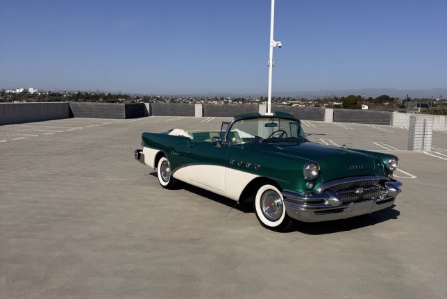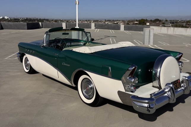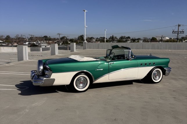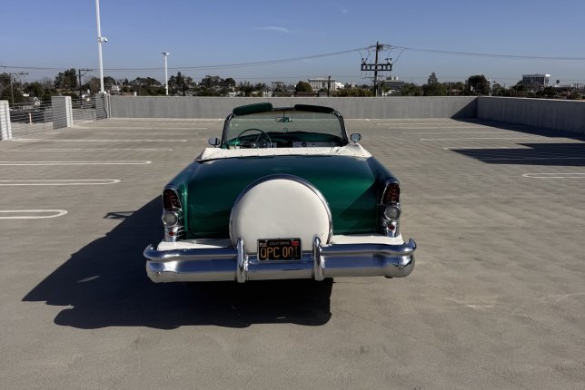 1955 Convertible Century Buick; color green and white with a white convertible top; Continental kit on back near the trunk area; Gangster whitewall tires with original Buick hubcaps; This American Classic is available for professional photo shoots; commercials; and corporate events.