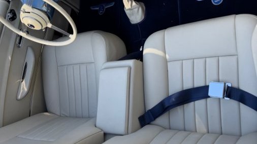 The interior is a lovely place to behold with the stylish period instrumentation and cream bakelite restored wheel. The rev counter is mounted in its correct position under the dashboard .