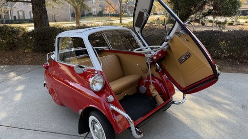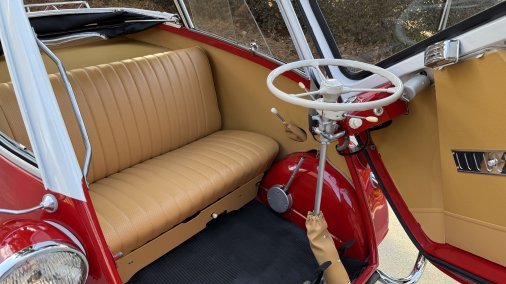 This 1957 BMW Isetta 300 cabriolet has been refinished in red and white and is powered by an air-cooled 297cc single driving the rear wheels through a four-speed manual gearbox. Equipment includes a roll-back sunroof, a folding rear window, a single bench seat, and a luggage rack with an optional picnic set. An absolute head-turner that brings a smile every time. Available for photo shoots, movies, and special events.