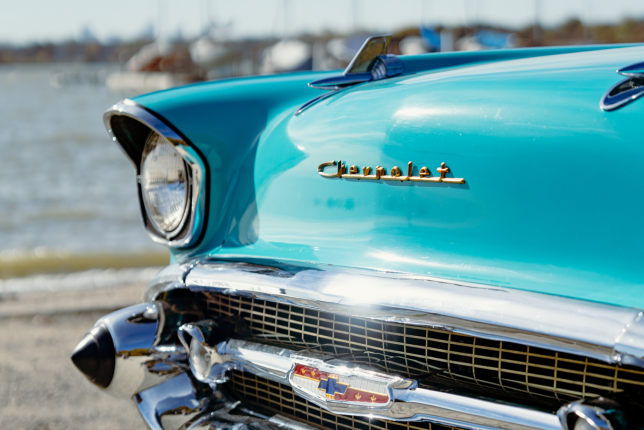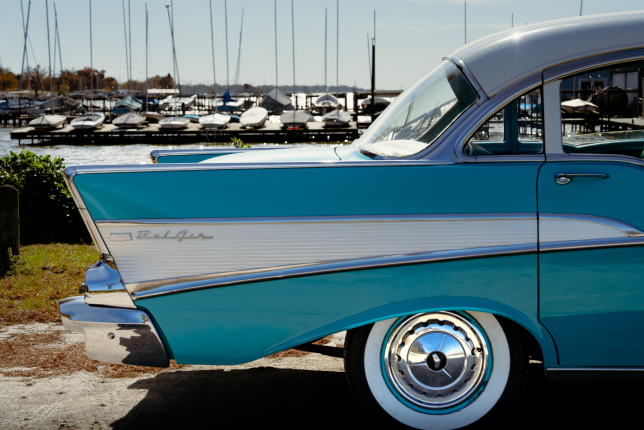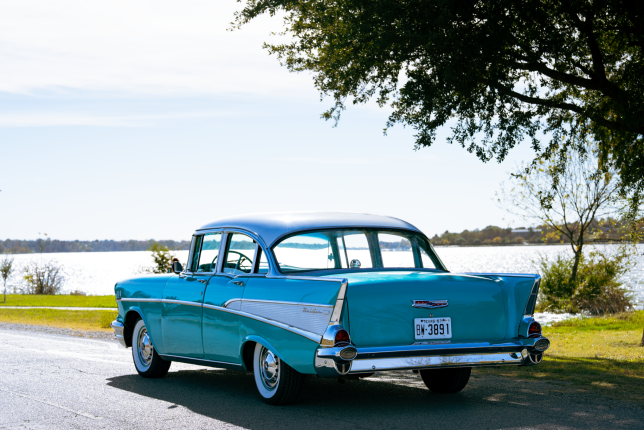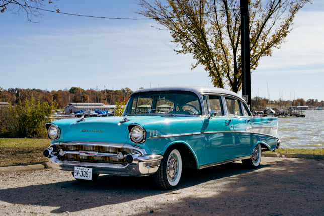The incomparable 1957 Chevrolet Bel Air. No other car recalls the timelessness and optimism of the 1950s quite like the "57 Chevy." In the classic turquoise on white color scheme with matching interior and white wall tires, this iconic car exudes style and nostalgia.