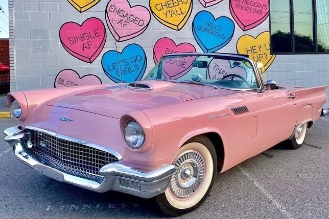 Rent a pink 1957 Ford Thunderbird! Perfect for photo shoots, engagement shoots, wedding shoots, mini sessions, holiday shoots & music videos.