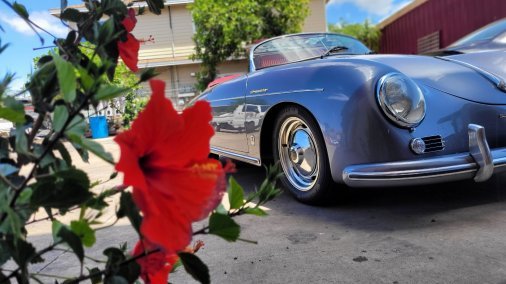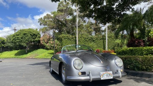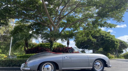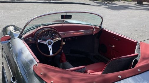 Reproduction 1957 Porsche 356 Speedster convertible with soft top.