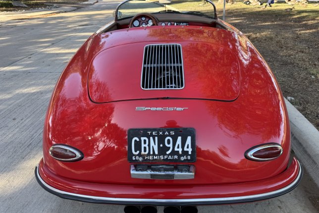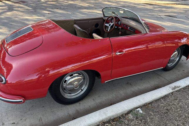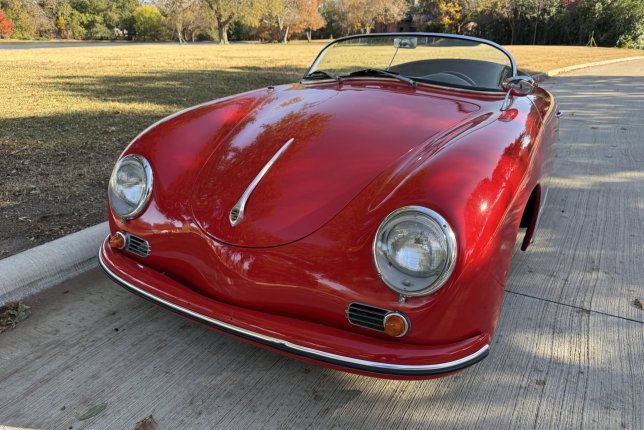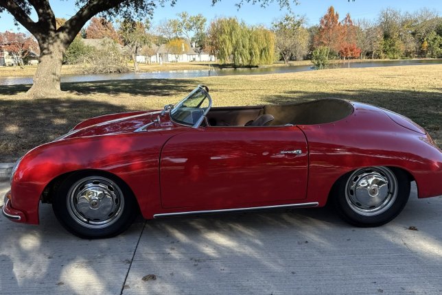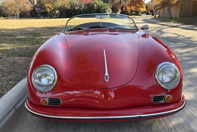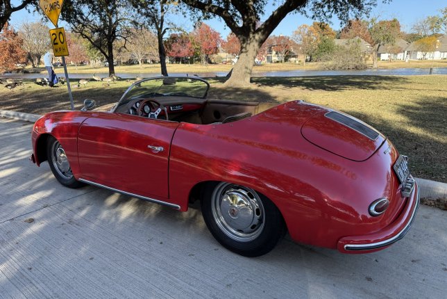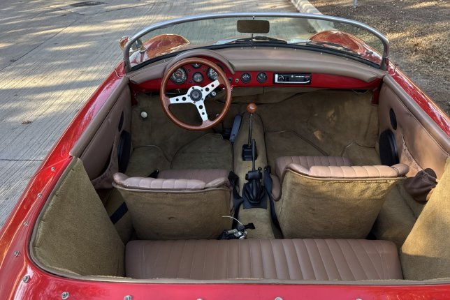 Fiberfab Replica Speedster finished in a beautiful red exterior with tan leather interior. upgraded drivetrain with a 2156 cc 4 cyl engine and a 4 speed manual transmission.