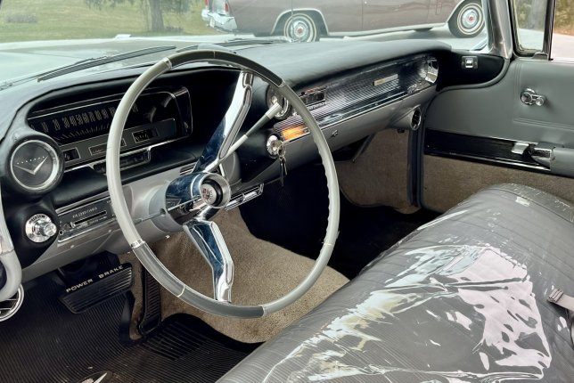 Luxurious Cabin: Inside, the 1960 Cadillac Series 62 is lavishly appointed with high-quality materials, including leather upholstery, plush carpeting, and a wealth of chrome and wood accents.