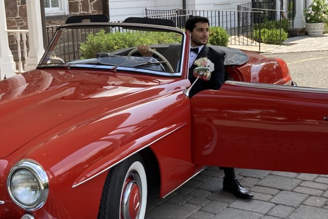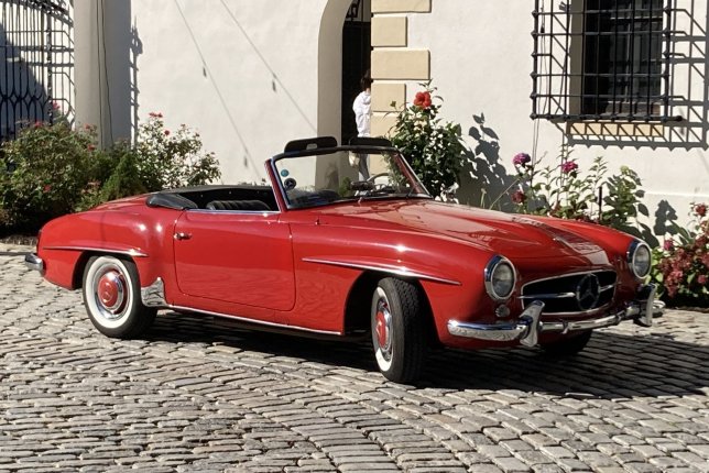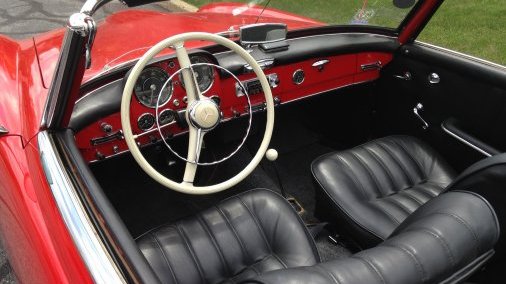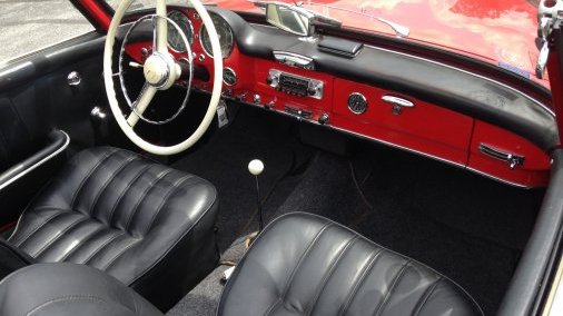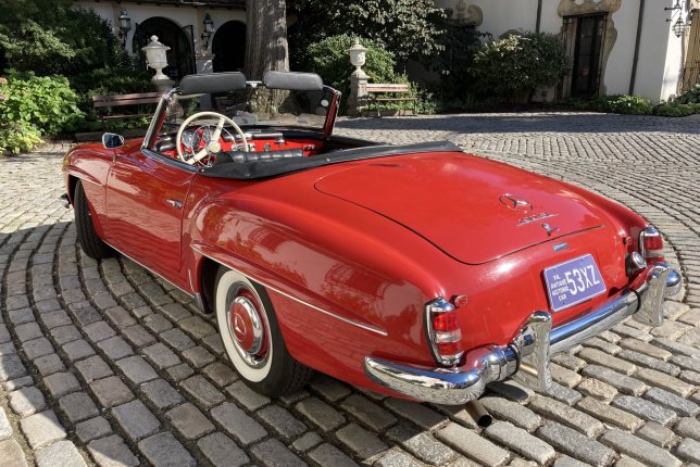This 1960 190SL is Fire Engine Red with a black canvas convertible top, black leather interior and wide whitewall tires. The top can be protected by a cool looking black leather boot cover when it’s folded down. There are a number of upgrades to make it more reliable, stable and easy to drive. It is well maintained and runs & drives just great. It's powered by a 1900 CC four-cylinder engine with upgraded Weber carburetors and a 4-speed standard manual transmission. It has a spacious lockable trunk, roll up windows, halogen headlights, AM/FM radio, heater and a lockable glove compartment. These cars are the siblings of the great Mercedes 300 SL with similar lines, sharing many parts as well. It is a fun car and looks great too.