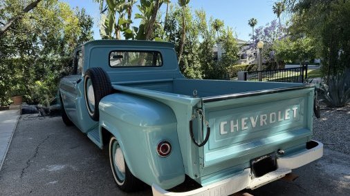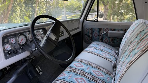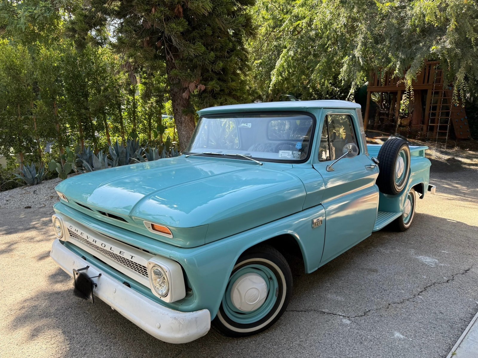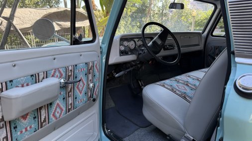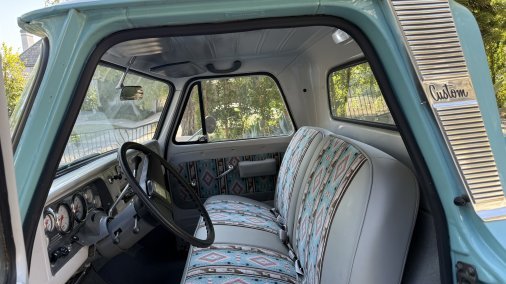 Baby blue 1966 chevy pick up C10 restored with reupholstered bench seat