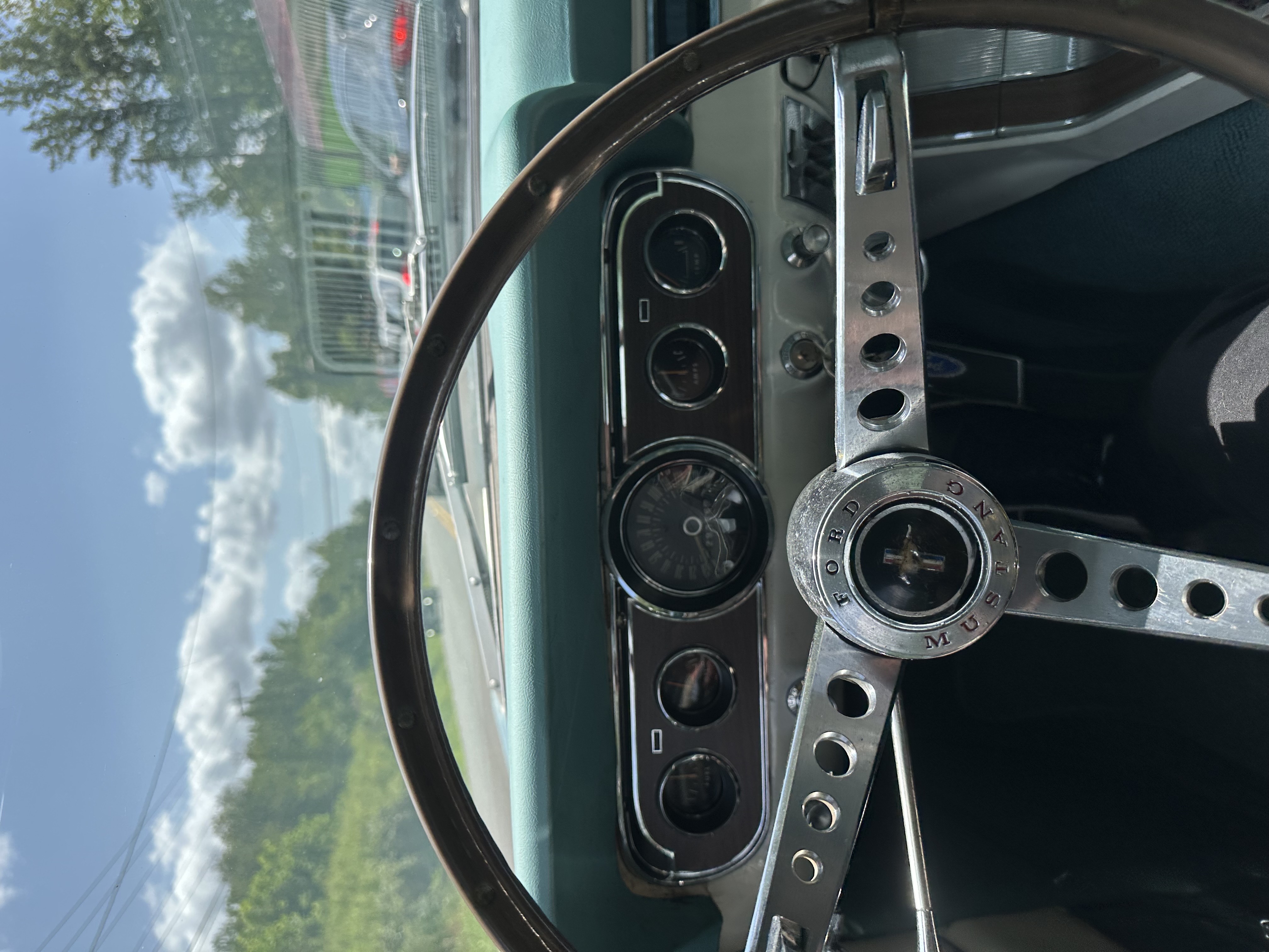 The color combo and interior are what make this pony car really stand out though. She sports her original Aqua Blue, but with a modern clear coat paint job. She has a blue and white pony interior with a center console for that cool vintage look.