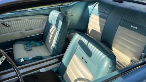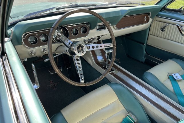 The color combo and interior are what make this pony car really stand out though. She sports her original Aqua Blue, but with a modern clear coat paint job. She has a blue and white pony interior with a center console for that cool vintage look.