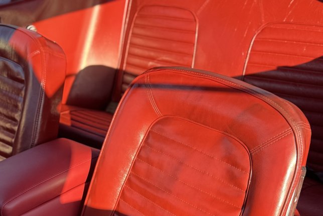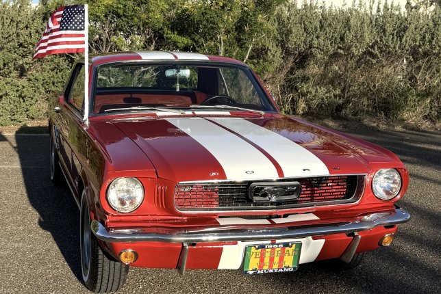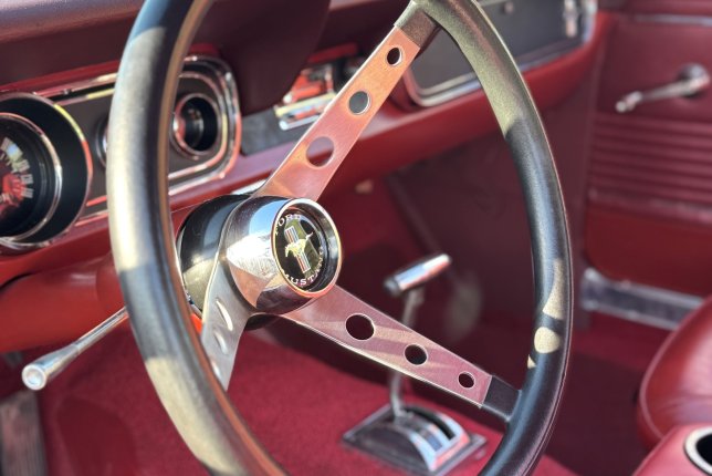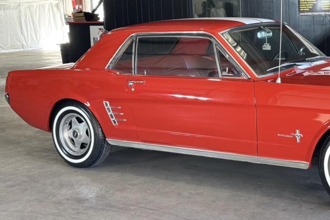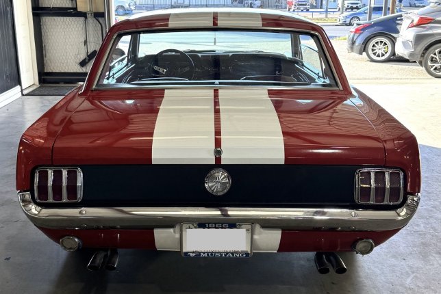 1966 Ford Mustang Base. Vehicle has been painted Candy Apple Red, with two white 10” Rally Stripes from bumper to bumper and a black taillight panel. The interior of the vehicle has been completely redone in red. The vehicle has Coker Classic 1” whitewall tires. Wheels are 14” Eagle Alloy Wheels.