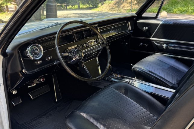 INTERIOR: Not only is it a really clean, unabused interior, it is very sporty and stylish. I love the dash, their is so much sparkling chrome. It has the big factory tachometer hanging there and gauges in the dash. It also has a working clock and an AM/FM radio. The clear plastic steering wheel is in excellent shape. It has a factory console between the bucket seats. Down on the floor there are reproduction mats and seat belts front and back.
