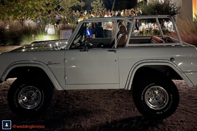 If requesting the Bronco as chauffeured transportation from venue to hotel, please note there is no top, nor is one available. Must be comfortable with riding in the rear seat of a convertible SUV, so please consider weather, wind, or happy to discuss a staged exit/arrival.