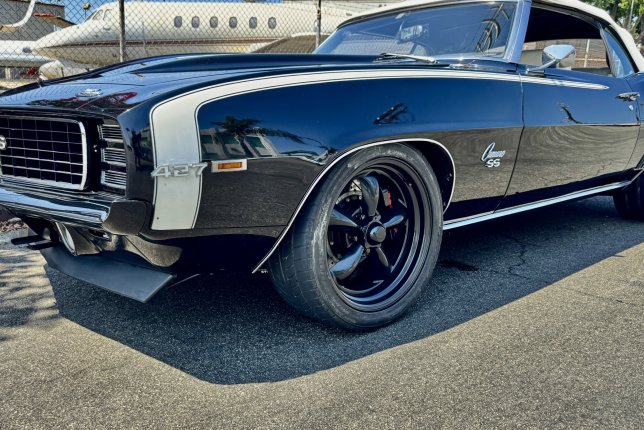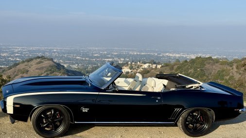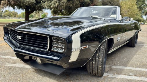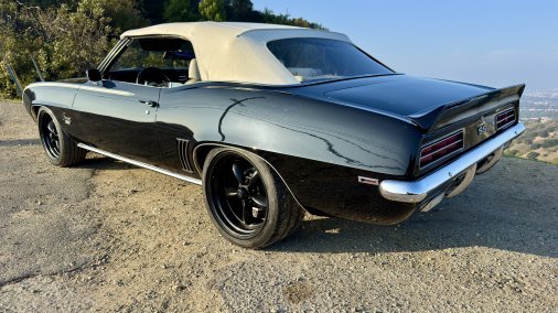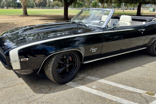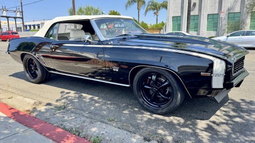 1969 Classic Camaro Convertible in Black with White Hounds-tooth interior. All new and Period Correct. Located in Encino. Owner stays with the car for the duration of the shoot. No min. This vehicle is available as: