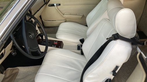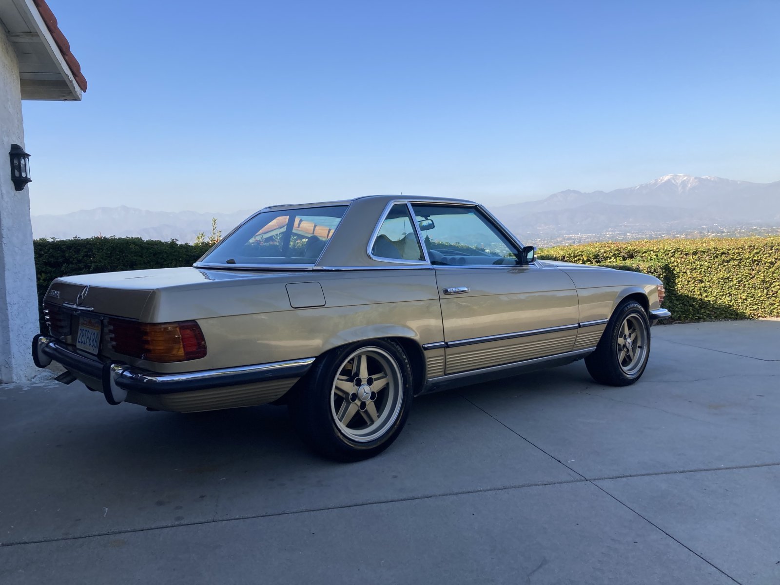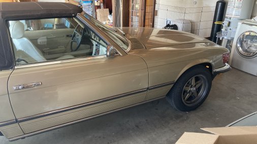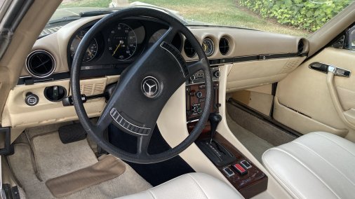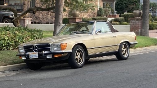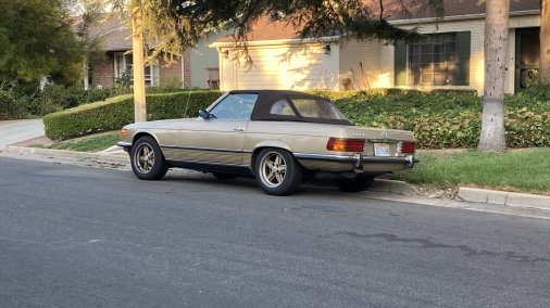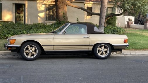 1972 Mercedes-Benz 350SL 4.5L. Color code 462H Tunis Beige (intermediate between gold and silver color, with some greenish undertones). Excellent mechanical condition; great interior/good exterior cosmetic condition. Hardtop available. Car has European-style headlights, Penta-Ronal wheels, and front spoiler. Although car is a 1972 model, fitments are suitable for post-1979 setting. Some exterior paint blemishes but no dents and otherwise very clean and reliable.