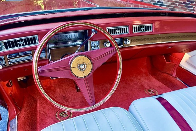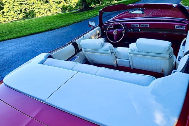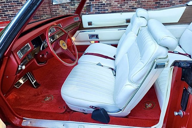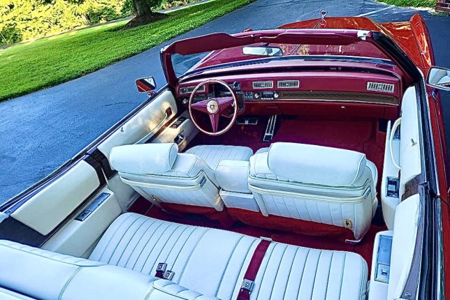 If you dream of floating along the California Pacific Coast Highway, there is no better choice than this red convertible Eldorado, featuring a luxurious white-and-burgundy interior.