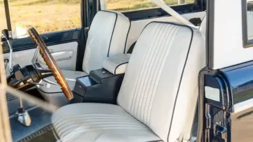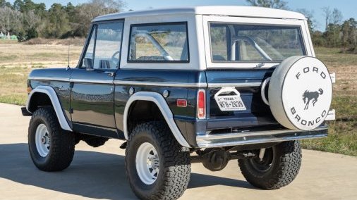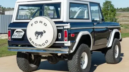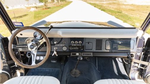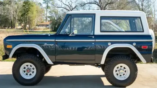 This 1974 Ford Bronco had a multi-year, body-off refurbishment that included replacing its 302ci V8 in May 2024. The truck is refinished in dark blue with a white hardtop over white upholstery, and it has a three-speed automatic transmission, power steering, dual fuel tanks, 15″ wagon wheels, 33″ BFG KO2’s, Rockford Fosgate audio components, a roll bar, and air conditioning