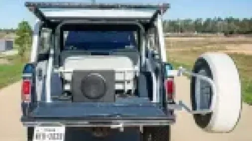 The body’s dark blue finish is contrasted by a white grille, removable hardtop, swing-out tire carrier, and wheel arch extensions, and the truck has chrome bumpers, headlight bezels, side moldings, and taillight surrounds.