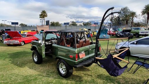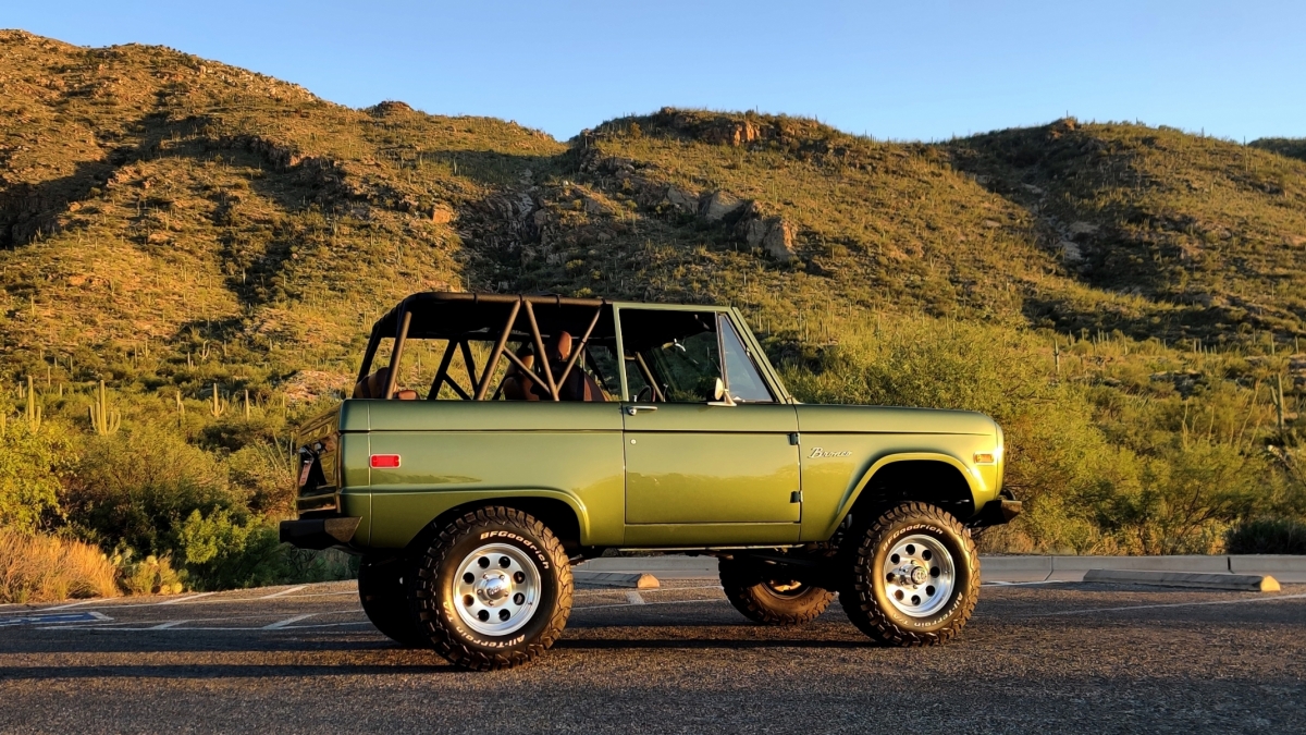 Restored 1974 Ford Bronco painted in F8 Metallic Green. Original uncut rear fenders with 3.5" of suspension lift on 32" tires. Refreshed original 302 V8 with a C4 automatic column shifter. Custom 2 tone vinyl interior and an 8 point family style roll cage with a black bikini top. Custom painted dash with a touchscreen stereo and backup camera.
