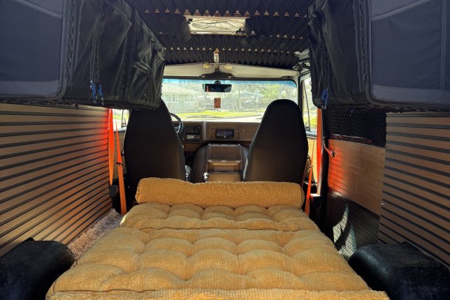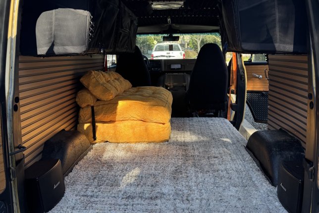 Spacious cargo area with built in soft shelves and convertible orange futon. Fully insulated and sound proofed on the roof, pretty cool look.