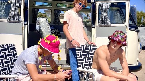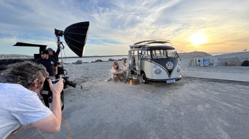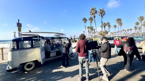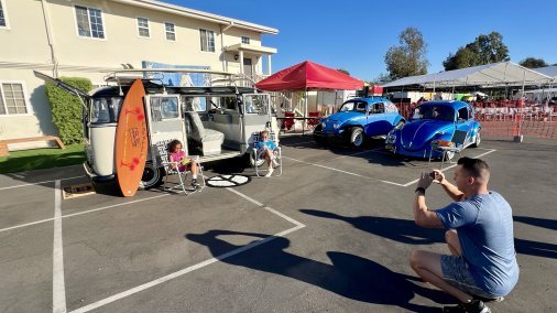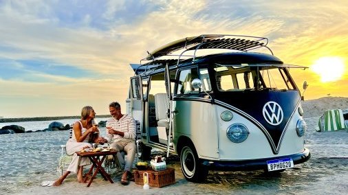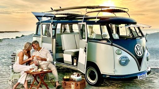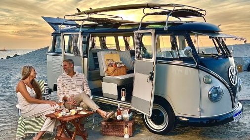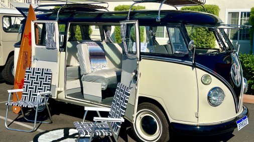 Fully restored VW 23 window Kombi passenger Bus finished in a cream & black paint! This bus is beautiful and comes with all the extras! Vintage luggage, vintage ice chest, Mexican blankets, wood grain surfboard, luggage racks, matching web chairs, peace sign rug & even accessories to dress up in such as retro sunglasses, peace sign necklaces & hippie vests. Production company owned. Contact us for availability. This bus can be driven to your local location or flatbed transported anywhere. This is one of the nicest buses available! Available for event photo activations too!