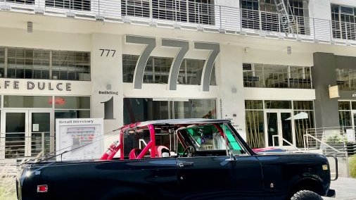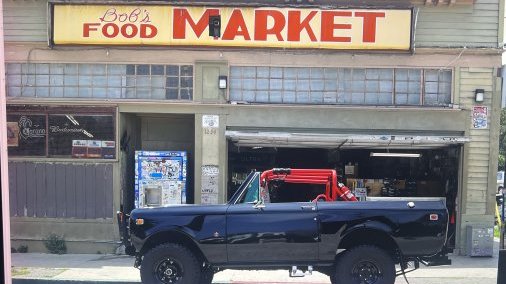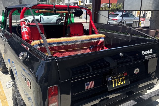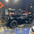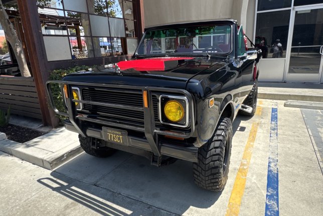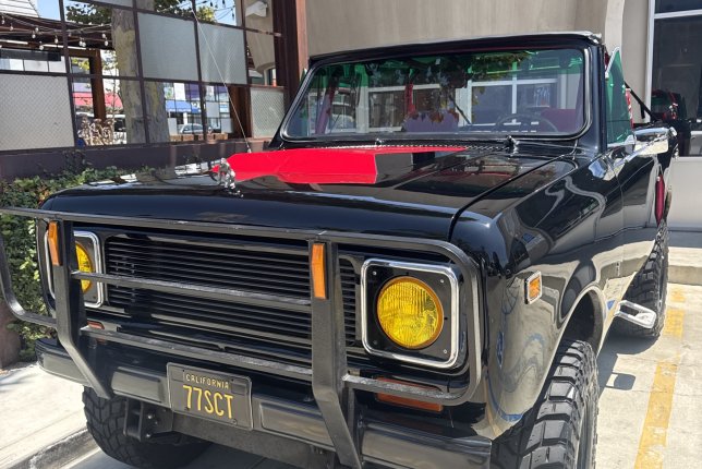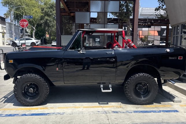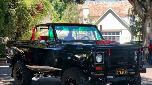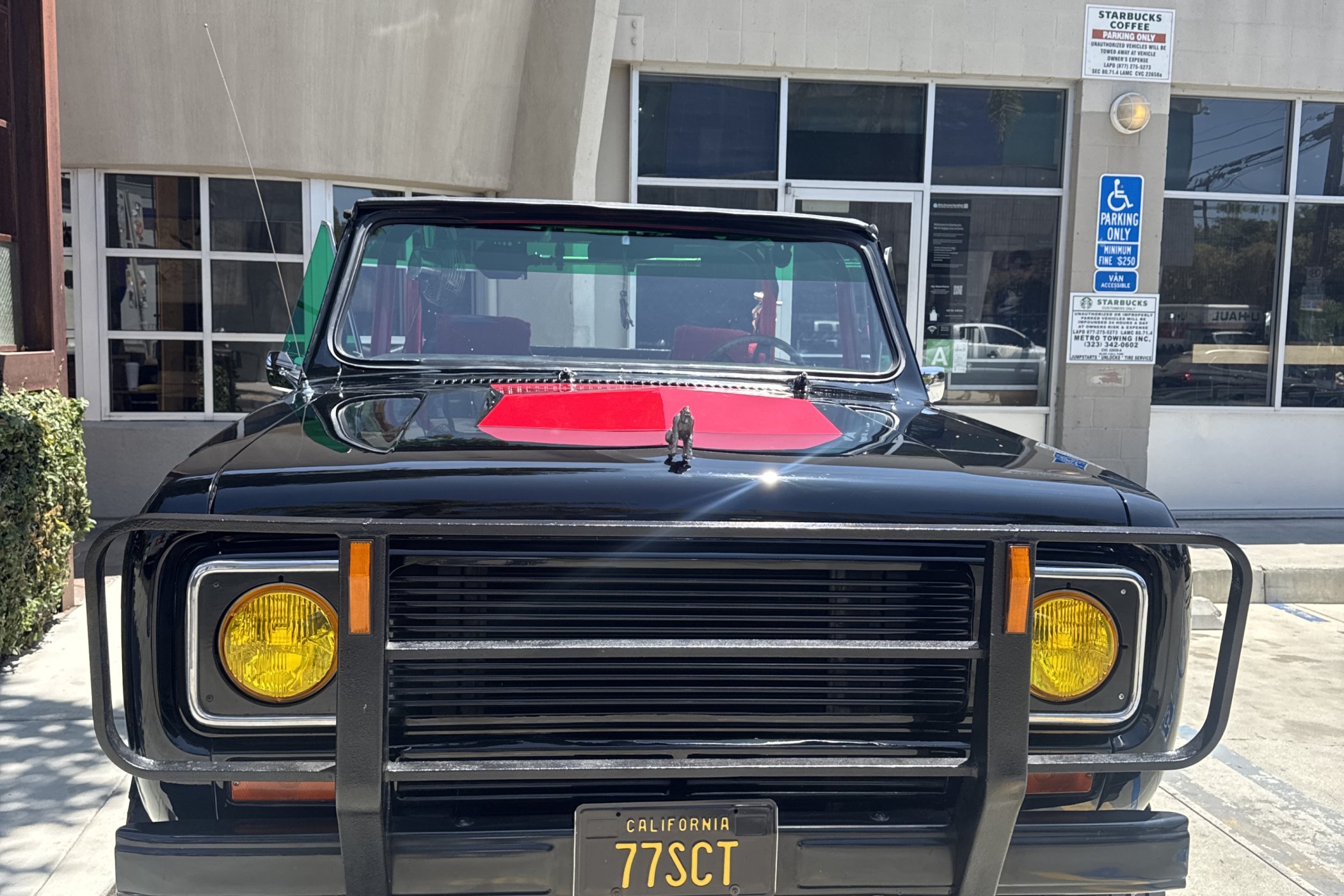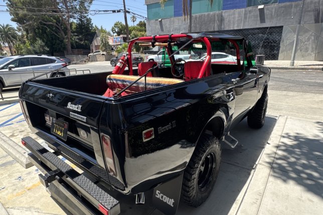 1977 international Scout open air vehicle black with red accents and a green window Tint ,restored a perfect paint job. Great sounding engine.