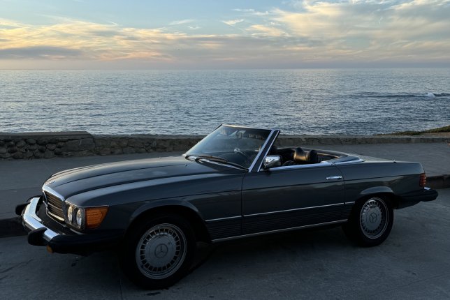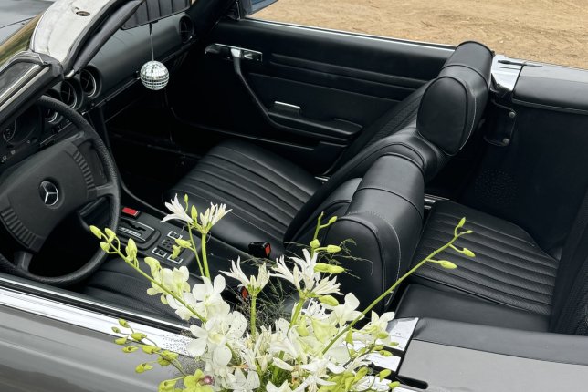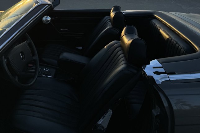 Experience a vintage California costal lifestyle with this classic car. Her name is Disco and she's a 1977 Mercedes 450 SL. Drive down the 101 with the top down and use for all your photoshoot needs. Dark grey exterior. Interior is black leather in excellent condition. Off market shiny chrome rims for a unique flare. It has a removable soft top to turn the car into a convertible. Suitable for two people and has extra space in the trunk and the backseat. Includes seat covers to keep it cool and clean.