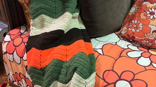 • Decked out with avocado green kitchen items, afghans, classic cocktail glasses, polaroid camera, 70s tennis rackets, orange & white lawn chairs, sunglasses, and more!