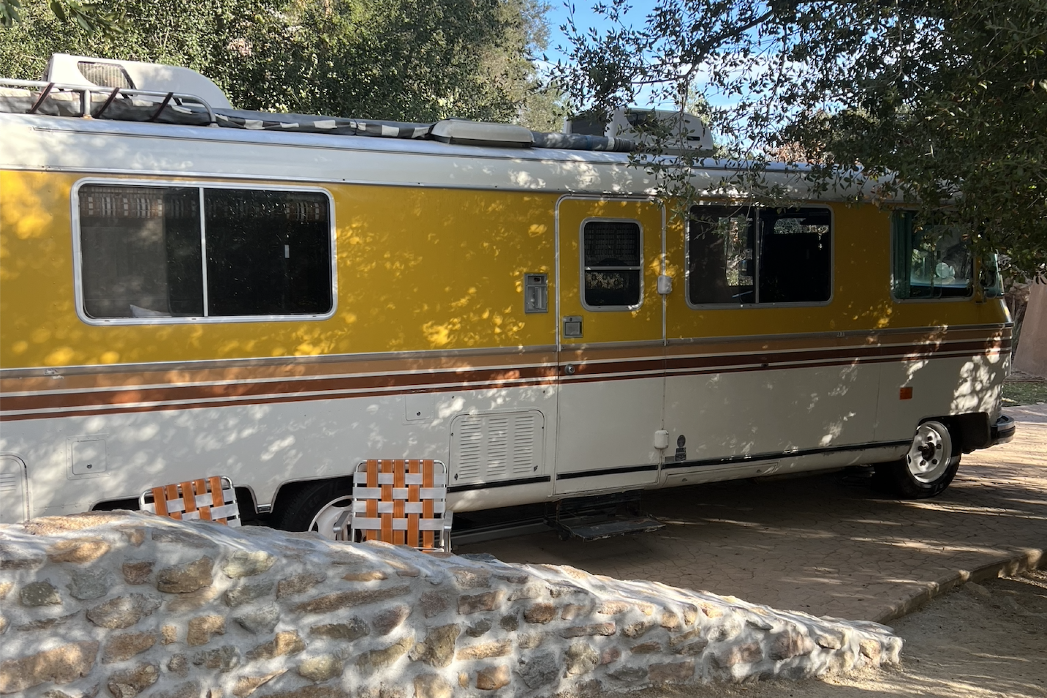 This listing is for renting Karl the Campervan, a vintage 1977 RevCon Buckingham 290 RV. It includes photos inside and outside while Karl is parked on location here at Hacienda 6 Palms in North San Diego. Renting Karl permits you to shoot in and around the RV location which has a fire pit, teak table, chairs, umbrellas, and all of the items inside the RV mentioned in the description including access to vintage clothes shown in the photos. Karl can be driven off site for additional delivery and driver fees. Ask us about taking Karl to your on site locations such as Joshua Tree, Palm Springs, the Salton Sea, Glamis San Dunes, or up to LA to your Hollywood Movie Studio!