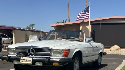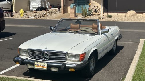 This is my 1979 Mercedes-Benz 450sl! It has an excellent condition Palomino Interior with a White exterior that has matching palomino colored stripes running down the sides. The car is also equipped with European-style headlights.