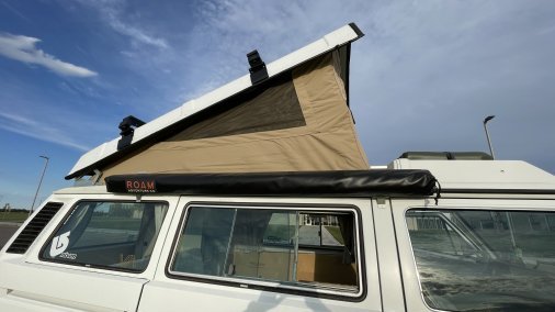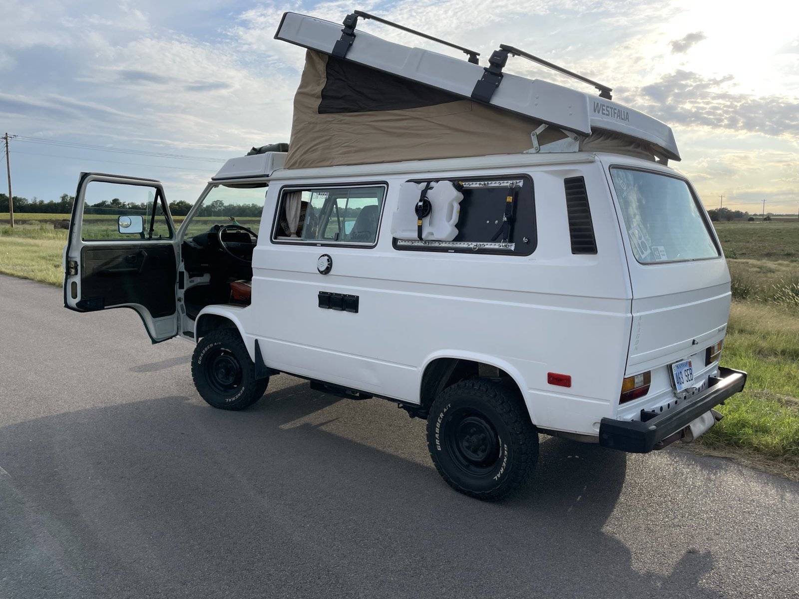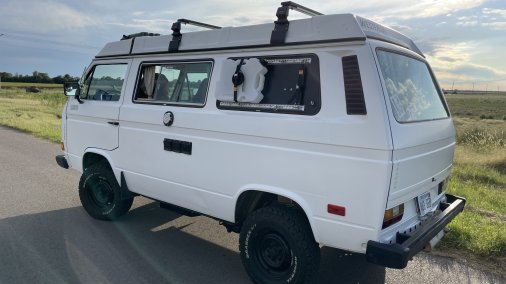 VW Vanagon westy. This van has 2 full sized beds. One up top with a brand new canvas pop top. Plenty of room for a family of 4. It is wrapped in 3M professional matte white vinyl. Rust free body in excellent condition With a go westy 2” lift, paired with new general grabber tires. New go westy canvas pop top. New upholstery front and back seats