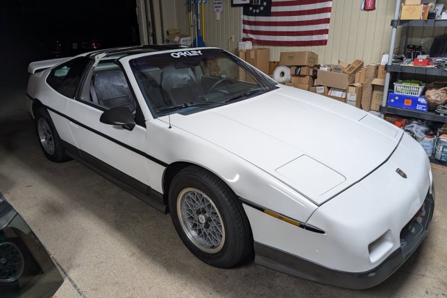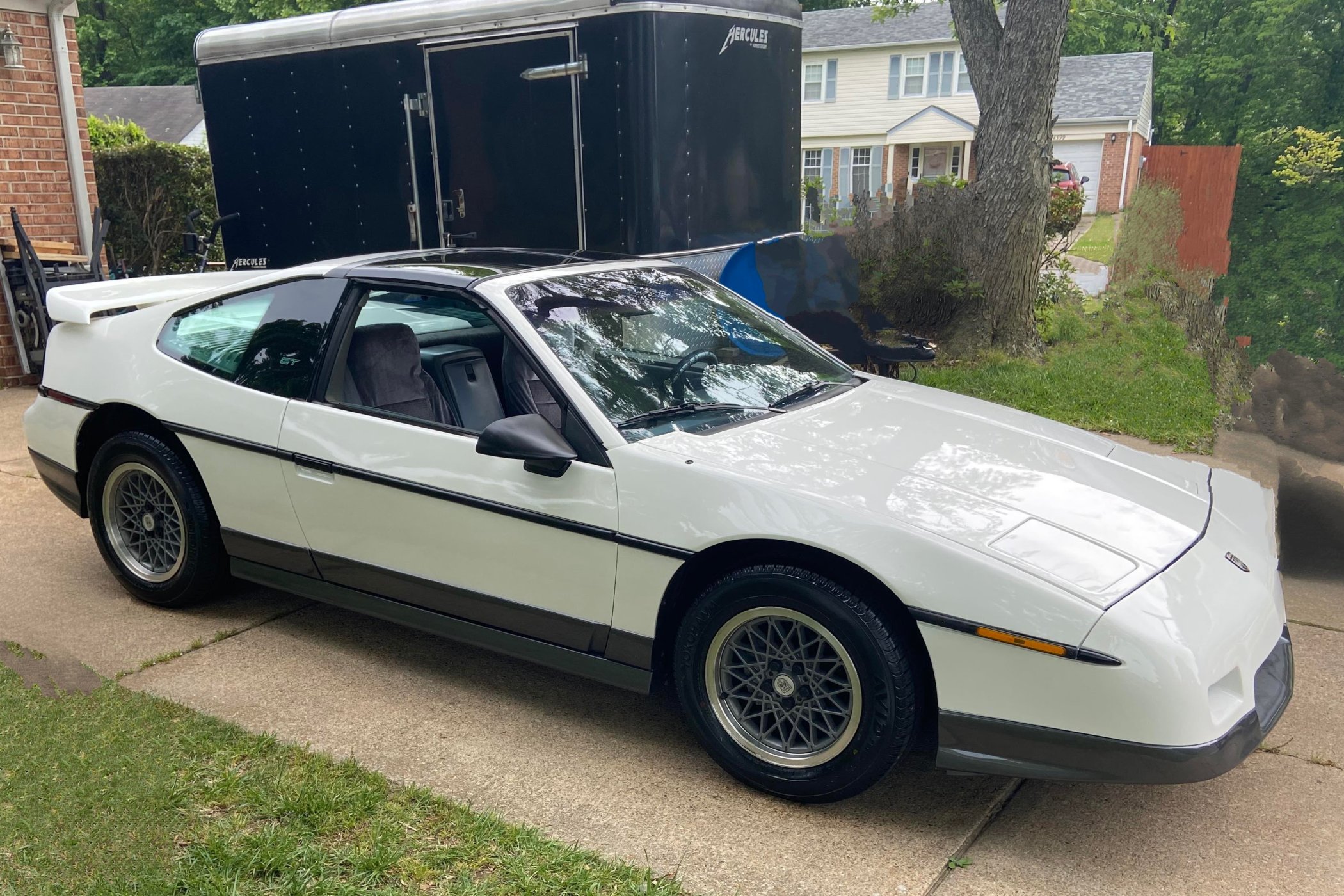 This is a blast from the 80s. The iconic Pontiac Fiero GT is painted in bright white over metallic charcoal gray at the bottom. This time capsule is beautiful from it's ttops down to its white letter tires. Stickers from the 80s adorn it along with the vintage cell phone mounted on the console.