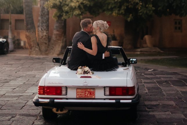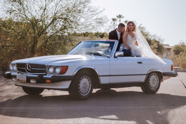 Classic Mercedes 560SL that looks new. The white exterior is perfect for photos with navy blue leather seats, chrome wheels and a navy blue soft top. Ideal for engagements, weddings, anniversaries, style shoots, commercials and movies. Car runs great, and even has working air conditioning. Fees are for pick up at our location, the car can delivered within 20 miles of Mesa for an additional fee. For trips beyond the Phoenix Valley additional information is required and mileage rates apply.