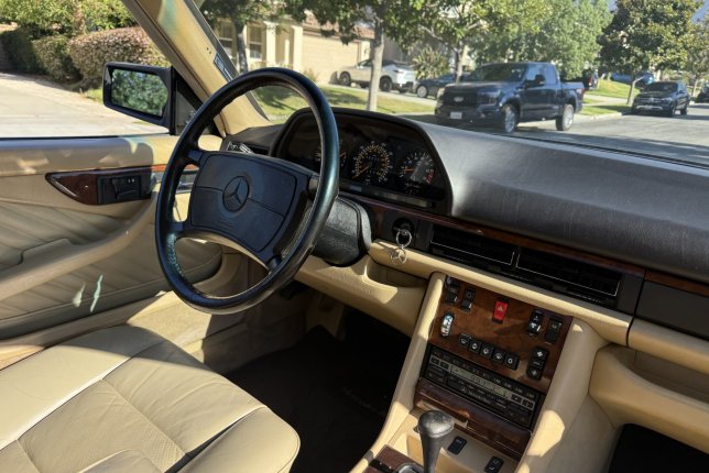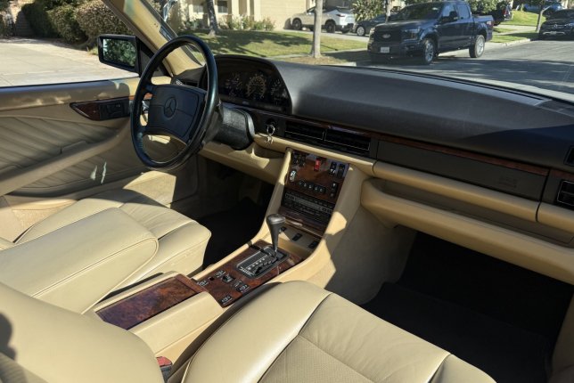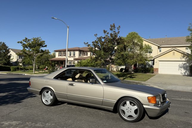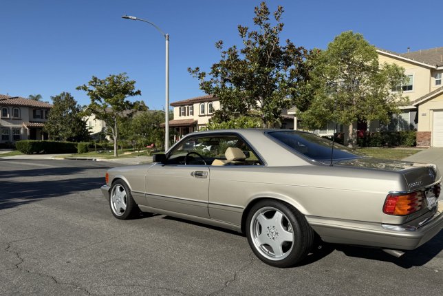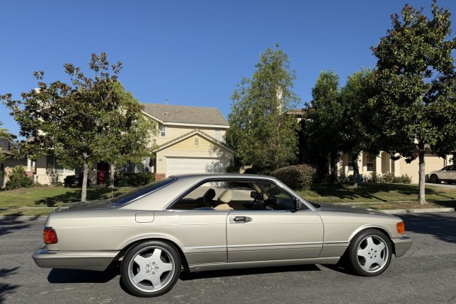 This 1990 Mercedes-Benz 560SEC is powered by a 5.5-liter M117 V8 paired with a four-speed automatic transmission and is finished in Smoke Silver Metallic over Creme Beige leather. Equipment includes AMG 18″, a limited-slip differential, a self-leveling rear suspension, a sunroof, heated power-adjustable front seats, dual front airbags, a Becker cassette stereo, cruise control, and automatic climate control.