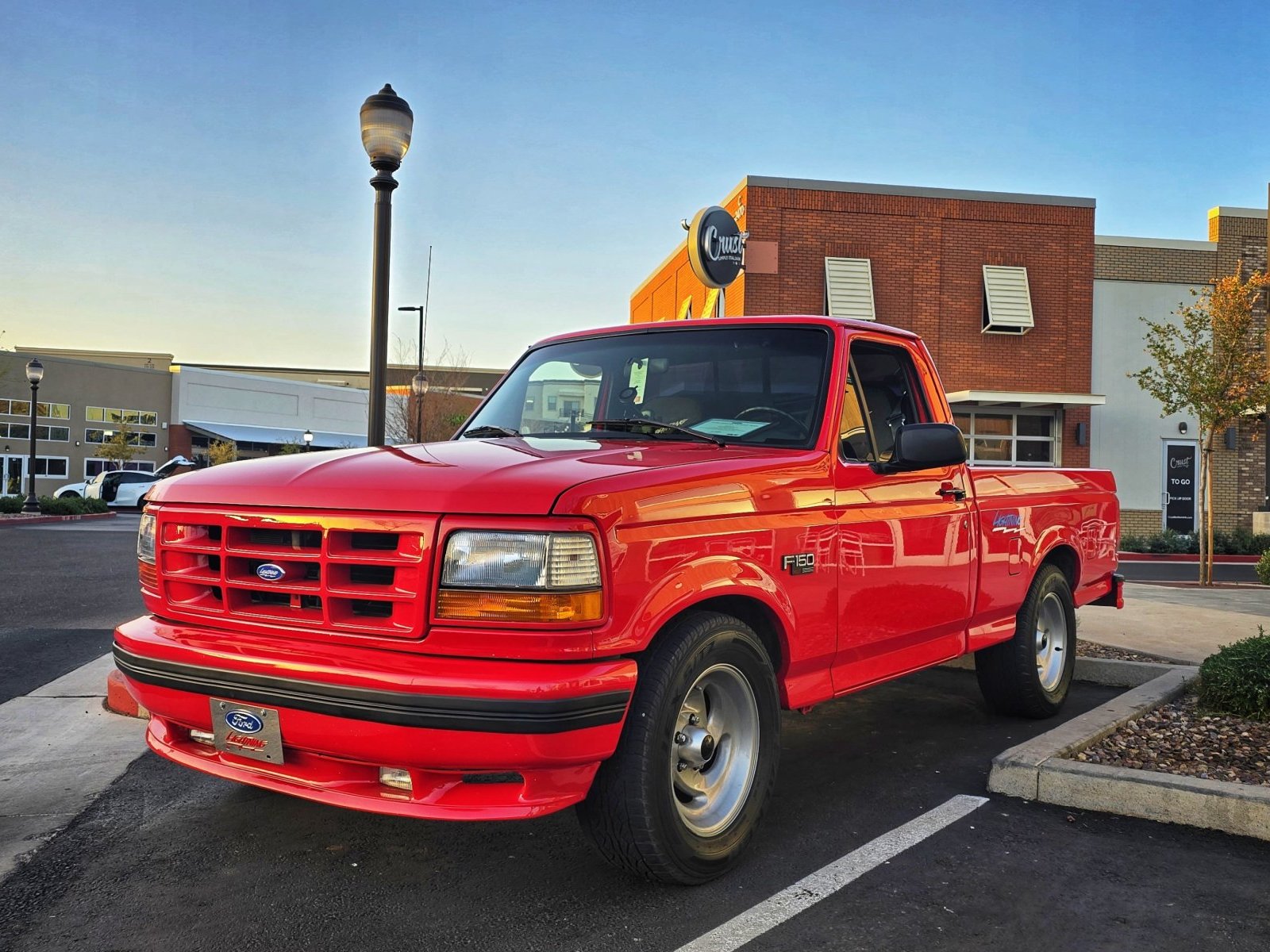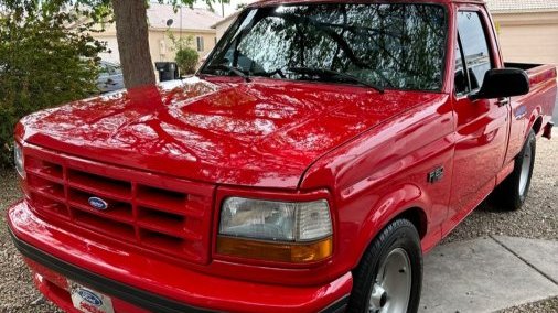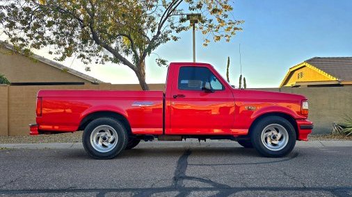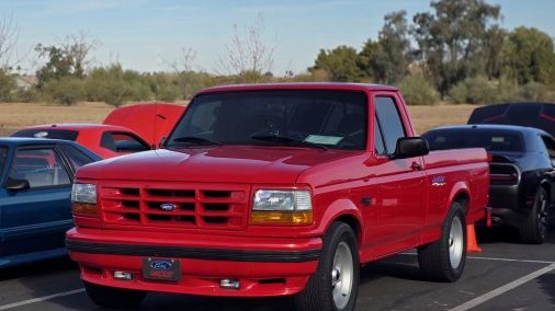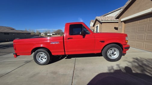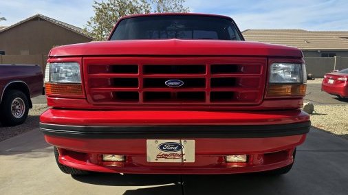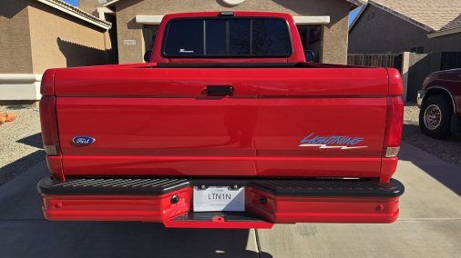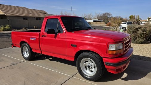It is a 1993 Ford F-150 Lightning SVT, Vermillion Red with an opal gray interior. It is completely stock aside from an aftermarket exhaust system. It is build number #4599 of 5276. It has a sport suspension for better handling than a standard F-150, and a different engine as well: a 351 Windsor with an E4OD 4-speed transmission and 4.10-geared rear end. Unique exterior badging denotes its limited edition status, with Lightning badges. The interior also features special bucket seats with the Lightning badge/logo