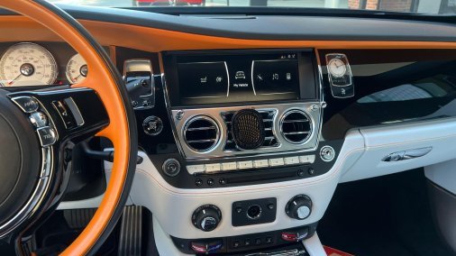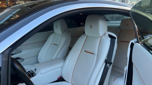 Rolls-Royce Wraith coupe in black over a bespoke white leather cabin with mandarin/orange contrast piping and RR embroidery. Deep chrome grille, coach-style doors, and floating Spirit of Ecstasy. Interior features the starlight headliner, four-seat grand touring layout, high-gloss interior trims, and power-closing doors. Twin-turbo V12 with 8-speed automatic for effortless acceleration. Ideal for photo/video, luxury arrivals, and VIP city drives.