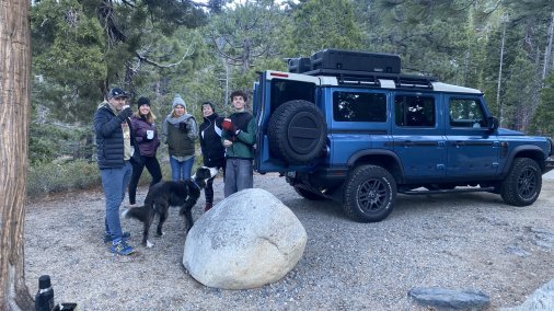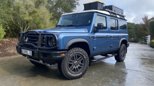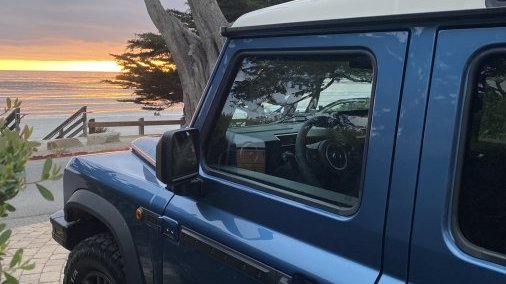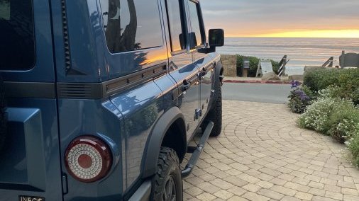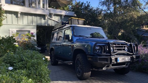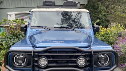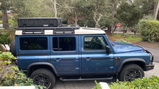 2025 Shale Blue INEOS Grenadier. Cream and black leather interior. Roof Racks with roof pods (pods can easily be taken off. Safari Windows (double sky-lights over driver and passenger- removable).